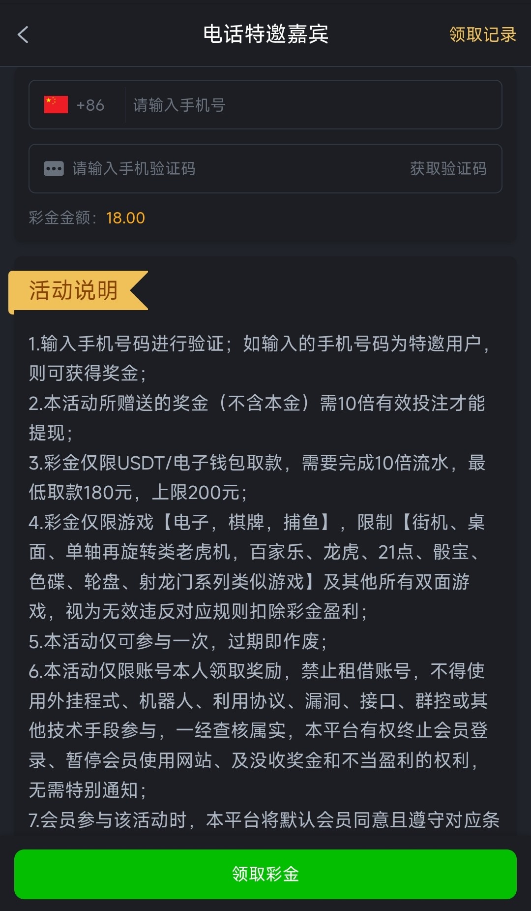 注册好账号后在优惠里找到“电话特邀嘉宾”在里面领取,10倍流水,限电子/捕鱼/棋牌,最高低180-200提款