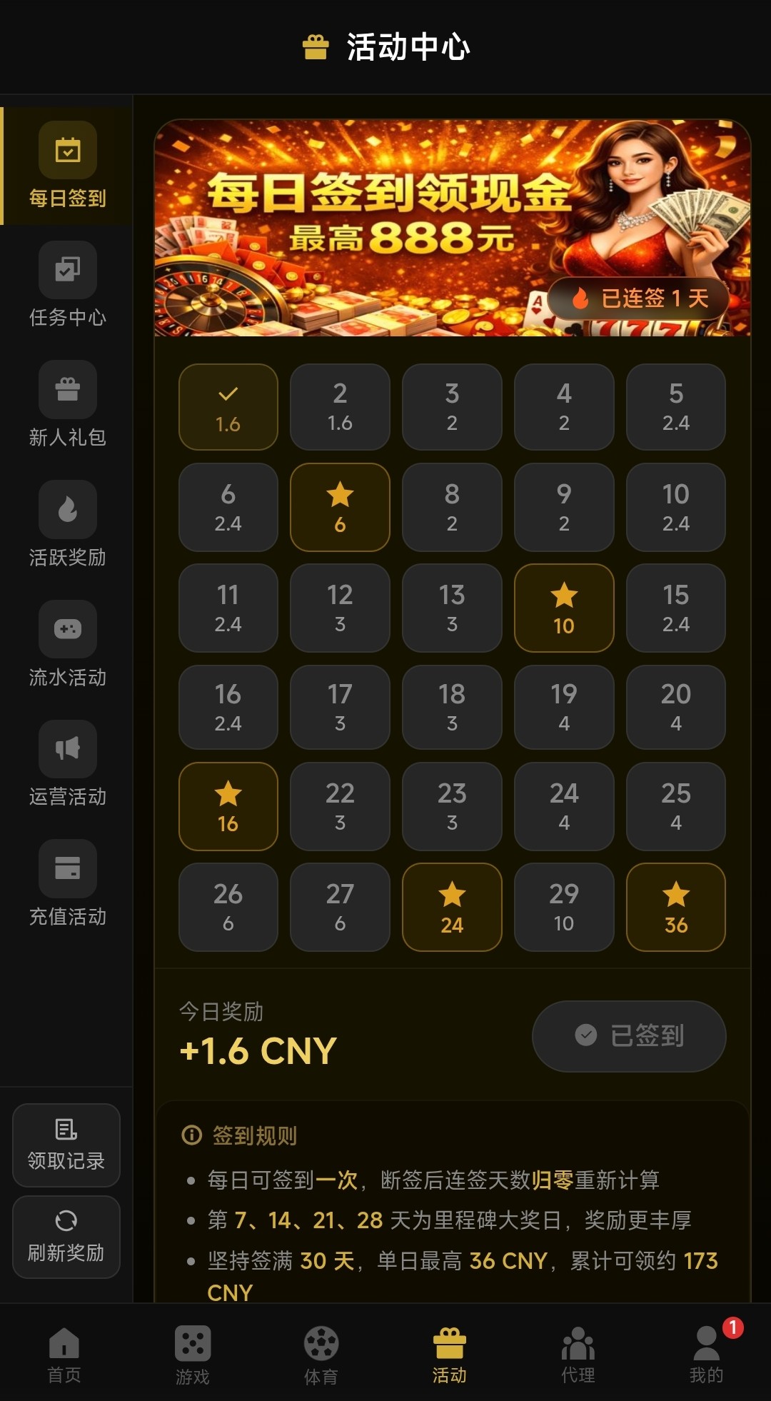 注册好后会有一个转盘弹窗出来,点击转动即可,优惠里有签到彩金跟新手任务彩金